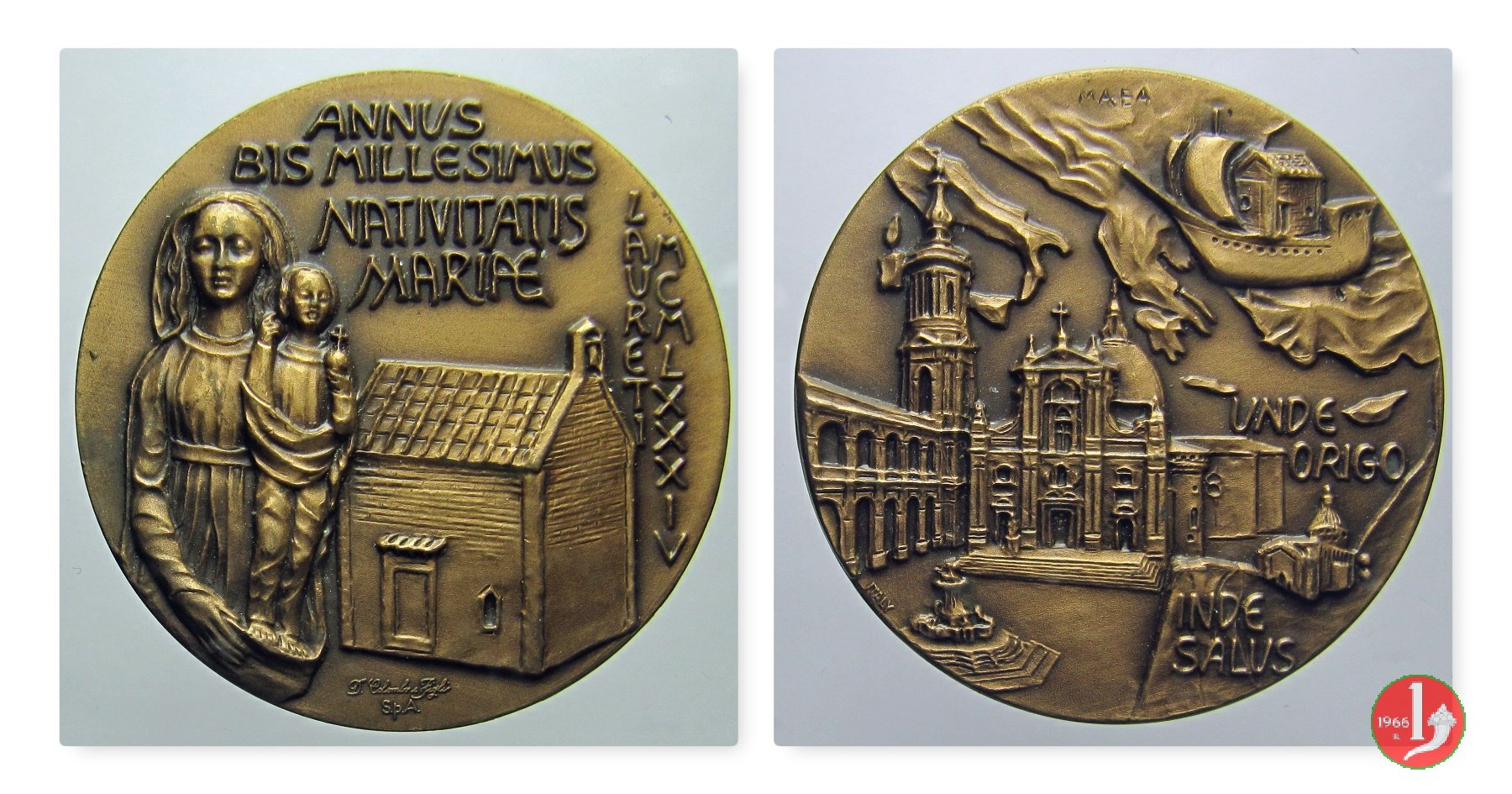 Medaglia coniata, realizzata nel 1984 dallo Stabilimento Damiano Colombo e Figli, per ricordare il bimillenario della nascita della B. V. Maria.