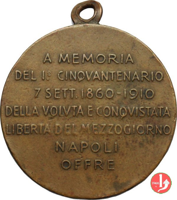 nel campo: A MEMORIA = DEL I° CINQUANTENARIO = 7 SETT. 1860 - 1910 = DELLA VOLVTA E CONQVISTATA = LIBERTA' DEL MEZZOGIORNO = NAPOLI = OFFRE