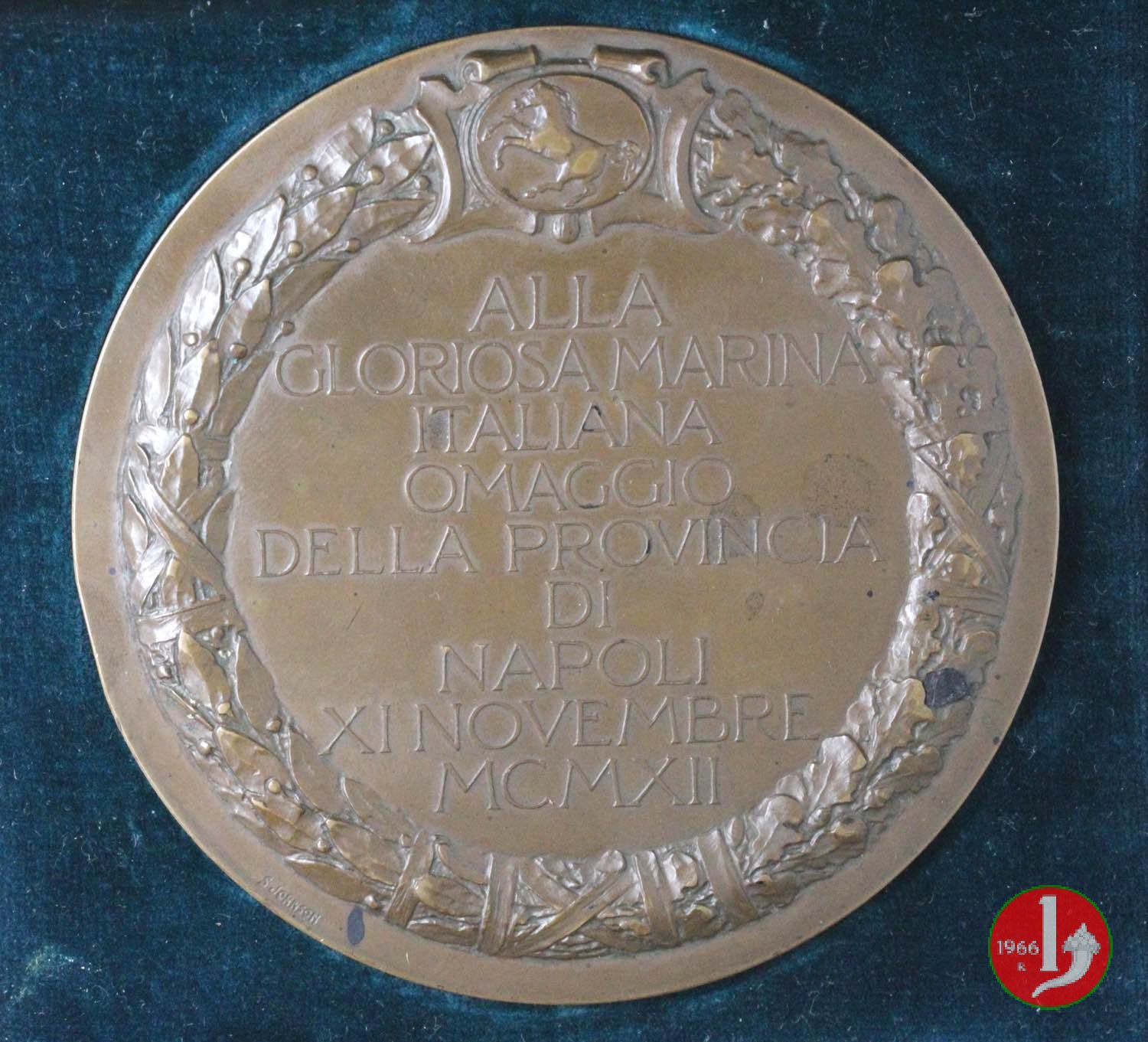entro ghirlanda d'alloro fermata da nastri semplici e incrociati sul contorno e sormontata da cartiglio con ovale contenete cavallo rampante a sx: ALLA = GLORIOSA MARINA = ITALIANA = OMAGGIO = DELLA PROVINCIA = DI = NAPOLI = XI NOVEMBRE = MCMXII
