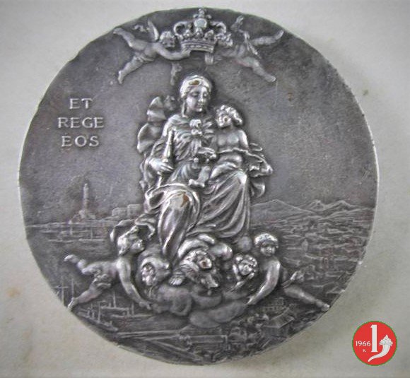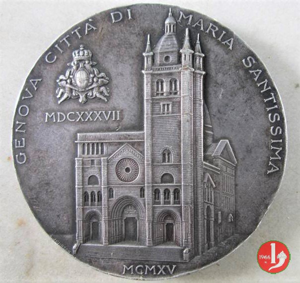 Medaglia coniata, realizzata nel 1915 a ricordo della Consacrazione Città alla Madonna Madre e Regina di Genova nel 1637; la medaglia probabilmente si riferisce anche all'invocazione di Benedetto XV (Papa Genovese) che con l'epistola del 27-04-1915, aggiungeva alle litanie l'invocazione alla Regina della Pace.