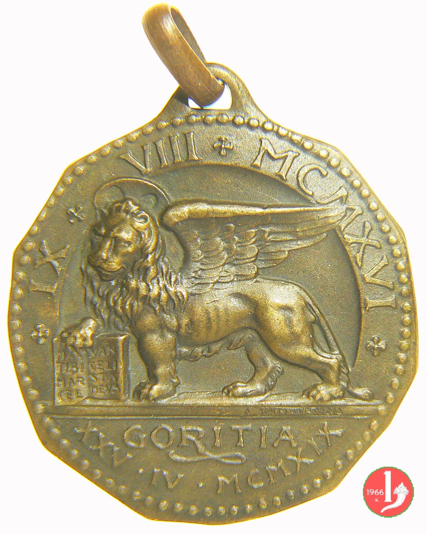 Medaglia coniata, emessa il 25-04-1919 per ricordare sistemazione del Leone di San Marco al suo posto, sul portone d'ingresso al Castello di Gorizia.