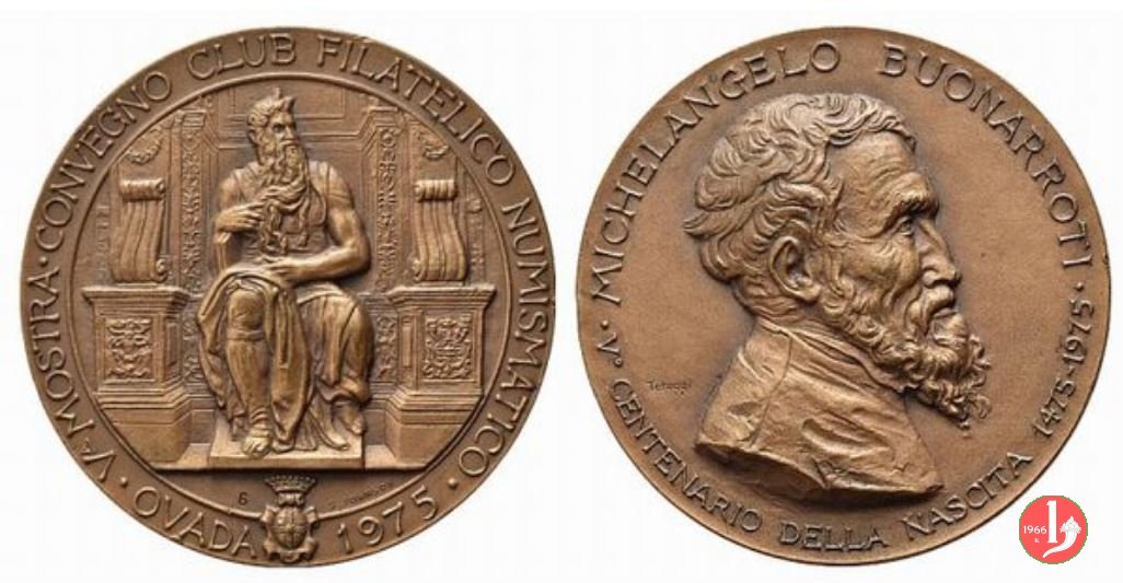 Medaglia coniata, realizzata nel 1975, con fondo opaco, dallo Stabilimento Stefano Johnson di Milano per il Circolo Filatelico e Numismatico di Ovada, per ricordare il quinto centenario della nascita di Michelangelo Buonarroti (1475-1564) e il quinto convegno Numismatico-Filatelico ad Ovada.
