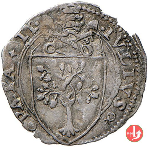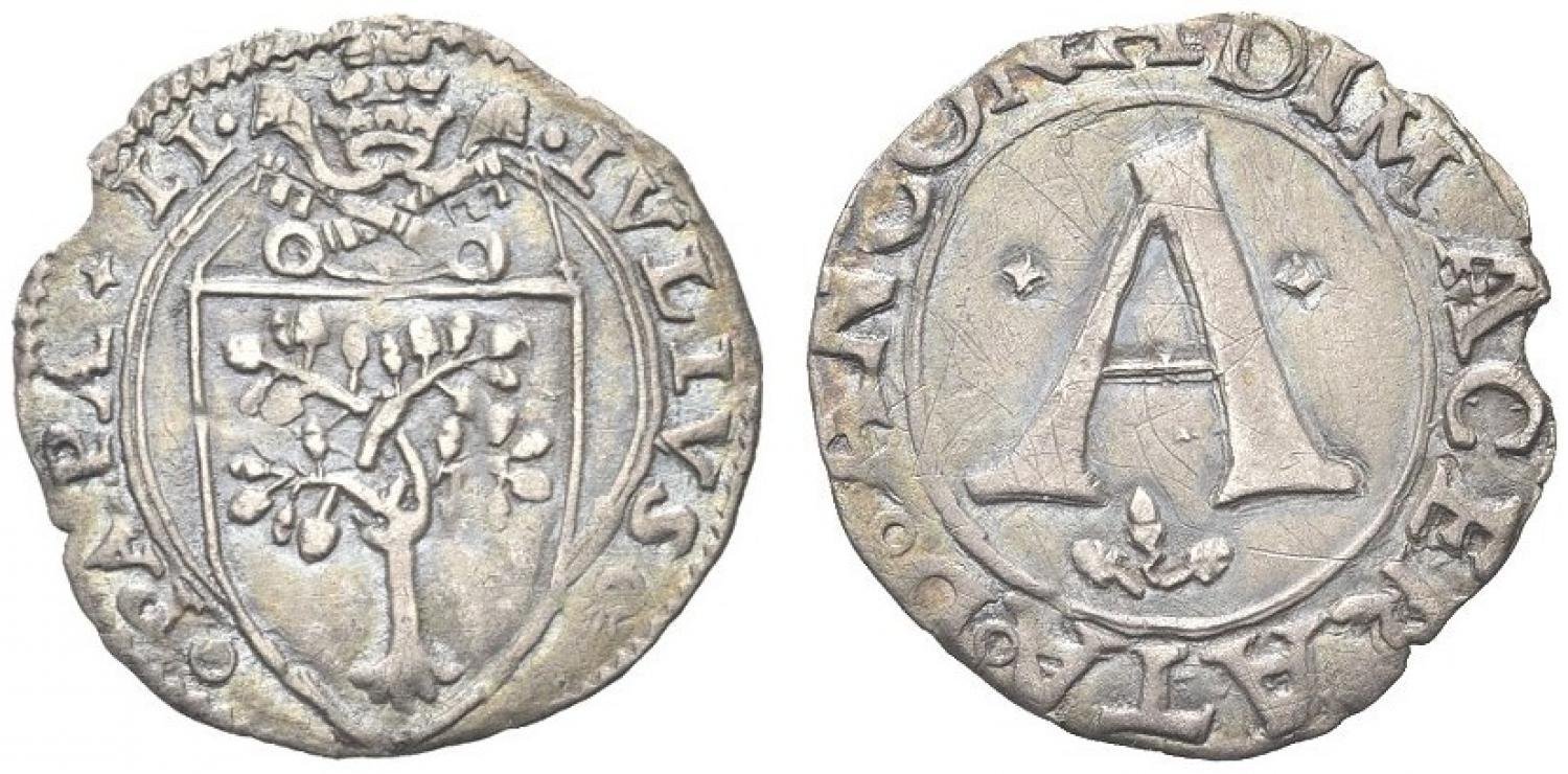 .IVLIVS°__°PAPA+II • / Stemma semiovale sormontato da chiavi dec. e da tiara DI MACERATA°D°ANCONA / nel campo, grande A con ai lati due crocette e sotto tre ghiande