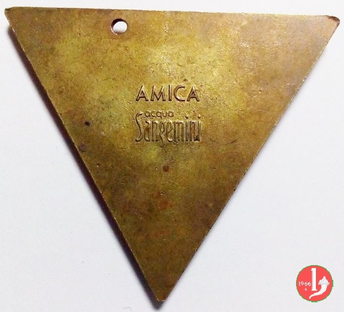 Medaglia triangolare coniata, realizzata negli anni settanta per la pubblicità dell'acqua Sangemini e distribuita dalla rivista Amica.