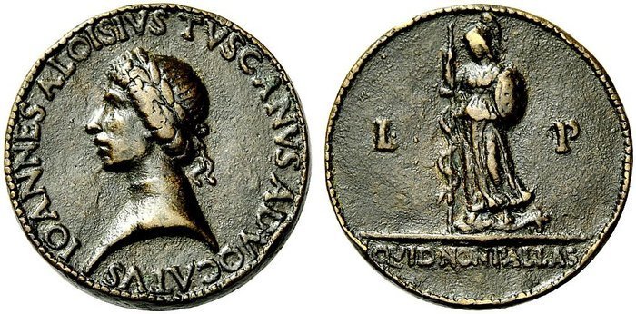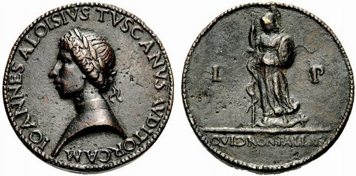 Medaglia originale fusa, realizzata nel 1475 circa. Lisippo dedicò ben sei medaglie all' amico Giovanni Alvise Toscani, che dal 1469 si trovava a Roma a studiare legge. Rinomato avvocato concistoriale, il 12 gennaio 1477 fu promosso Auditor Camerae Apostolicae, ed il titolo AVDITOR CAM rimpiazza quello di ADVOCATVS presente su questa medaglia. Morí prematuramente nel 1478. | ||||||