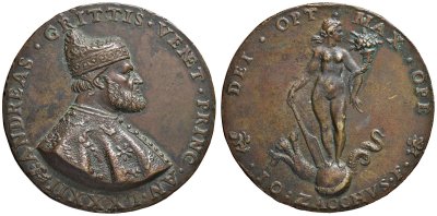 Medaglia fusa, realizzata il 20-05-1523 a Bologna, per ricordare l'elezione del 77° doge di Venezia: Andrea Gritti (1455-1538).