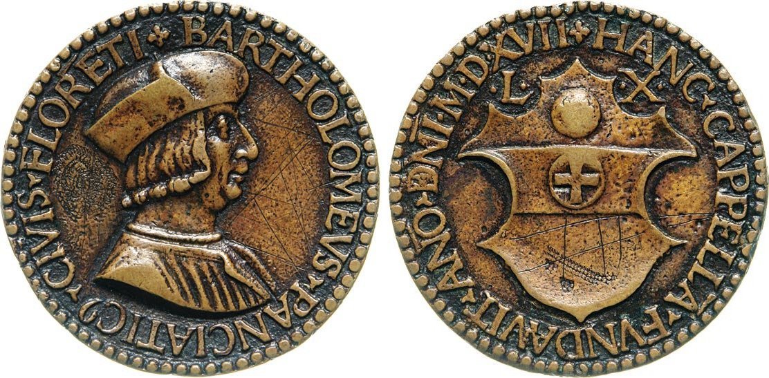 | Medaglia fusa, realizzata nel 1517, per ricordare Bartolomeo Panciatichi il Vecchio, mercante, di origini pistoiesi, con attivita' commerciali tra Firenze e Lione, padre di Bartolomeo Panciatichi il giovane (1507-1582). | ||||