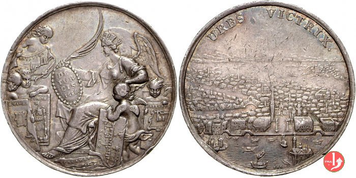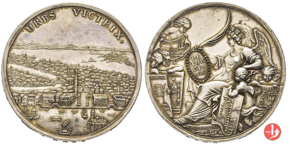 Medaglia coniata, realizzata nel 1686 dalla zecca di Norimberga, per celebrare le vittorie e le conquiste in Morea.