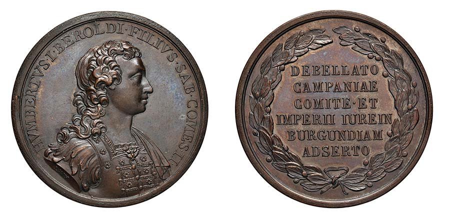 Medaglia di restituzione coniata, realizzata per la serie celebrativa della Real Casa Savoia, tra il 1864-65 su modello realizzato da Lorenzo Lavy tra il 1757 e il 1773. Umberto I Biancamano, figlio di Bertoldo, è ricordato nella medaglia per l'intervento, in difesa della Borgogna, contro il Conte della Champagne. | |||||