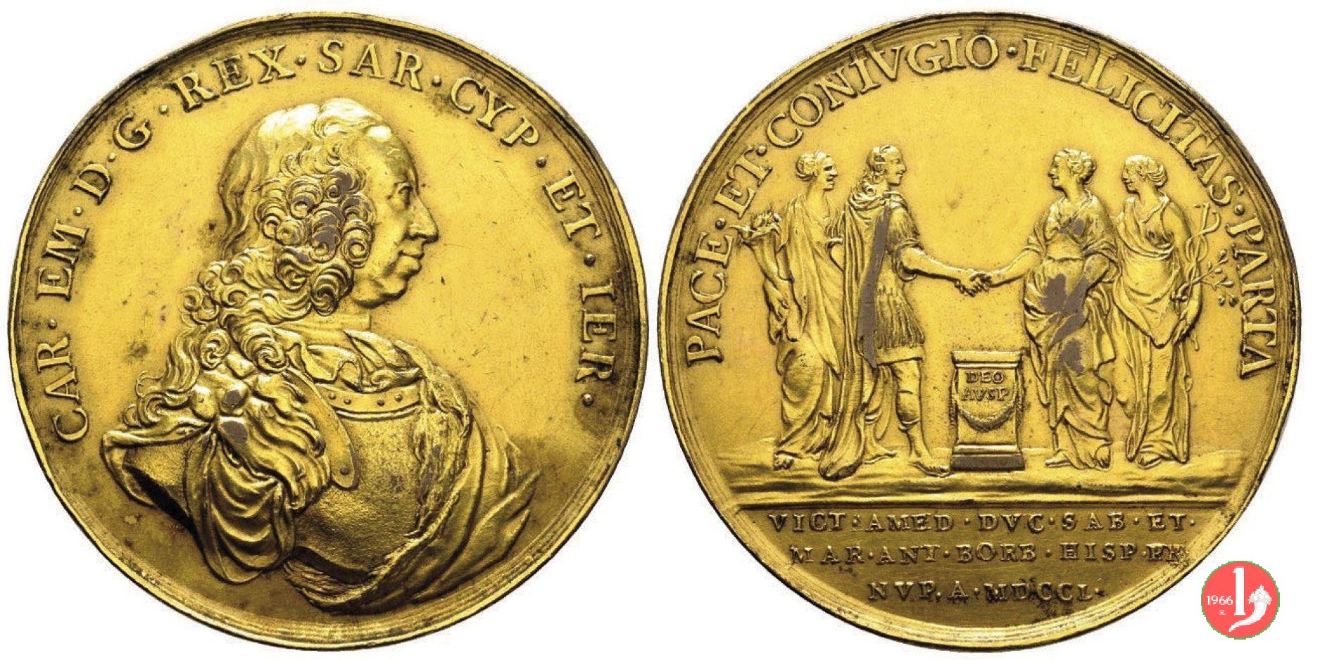 Medaglia coniata, emessa nel 1750 per ricordare il Matrimonio tra Vittorio Emanuele III e Maria Antonia di Borbone. III Tipo: al D busto senza incisore e mascherone sulla spalla e al V in esergo interlinee quasi uguali. | |||||||