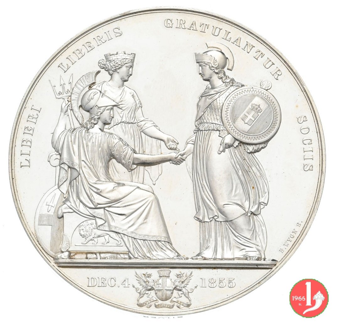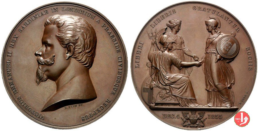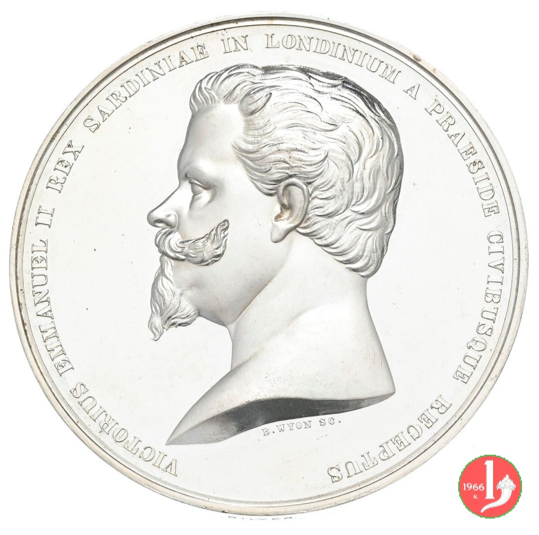 | Medaglia coniata, realizzata nel 1855, per ricordare la visita a Londra dal venti Novembre all'otto Dicembre di Vittorio Emanuele. | ||||||||