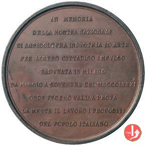 nel campo: IN MEMORIA = DELLA MOSTRA NAZIONALE = DI AGRICOLTVRA INDVSTRIA ED ARTE = PER LIBERO CITTADINO IMPVLSO = RADVNATA IN MILANO = DA MAGGIO A NOVEMBRE MDCCCLXXXI = ONDE FECERO VALIDA PROVA = LA MENTE IL LAVORO I PROPOSITI = DEL POPOLO ITALIANO