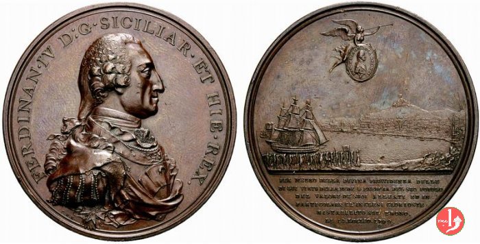 Medaglia coniata, realizzata nel 1799 per ricordare la restaurazione al trono di Ferdinando IV.