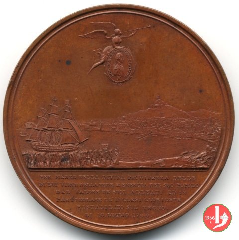 in esergo: PER MEZZO DELLA DIVINA PROVVIDENZA DELLE = DI LUI VIRTU' DELLA FEDE & ENERGIA DEL SUO POPOLO = DEL VALORE DEI SUOI ALLEATI ED IN = PARTICOLARE GL'INGLESI GLORIOSTE = RISTABILIRO SUL TRONO. = LI 10 • LUGLIO • 1799 •