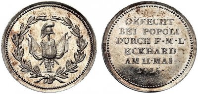 Medaglia coniata, emessa nel 1815 per ricordare la Battaglia di Popoli (Pescara) e la marcia degli Austrici sulle strade di accesso a Napoli.