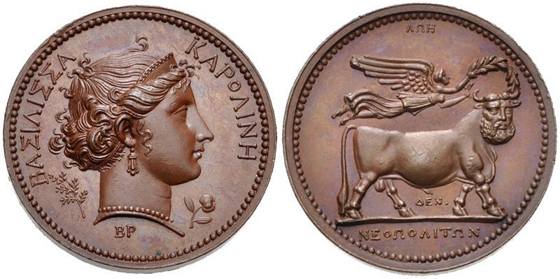 Medaglia coniata, realizzata nel 1808 in onore della regina Carolina Annunziata Bonaparte, moglie di Gioacchino Murat. La legenda al V in esergo significa: dei napoletani. | |||||||