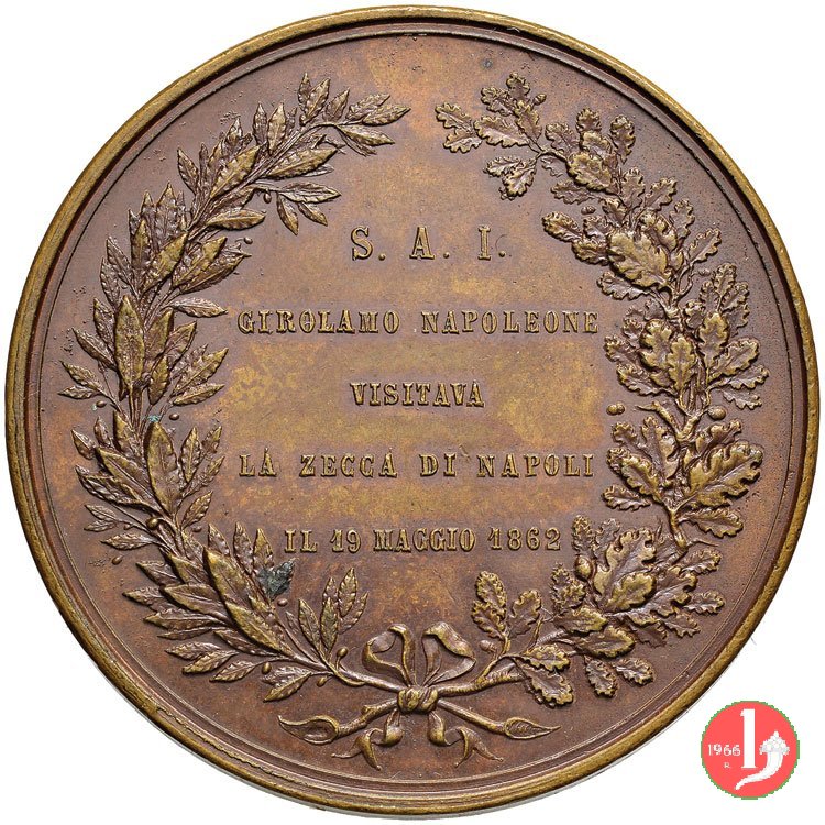 | Medaglia coniata, realizzata nel 1862 a ricordo della visita alla zecca di Napoli del principe Girolamo Napoleone. | |||||||
