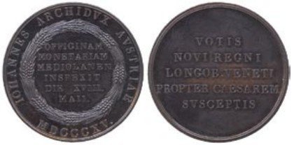 Medaglia coniata, emessa il 18-05-1815, per ricordare la visita dell'Arciduca Giovanni d'Austria alla Zecca di Milano.