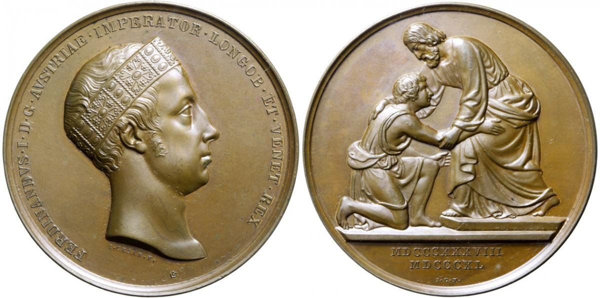 Medaglia coniata, realizzata nel 1838 per ricordare l'amnistia, concessa per i reati politici, in occasione dell'incoronazione di Ferdinando I d'Austria nel Duomo di Milano.