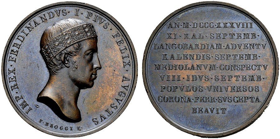 | Medaglia coniata, emessa il 11-09-1838, per ricordare l'incoronazione di Ferdinando I, nel Duomo di Milano, a Re del Regno Lombardo-Veneto. | |||||