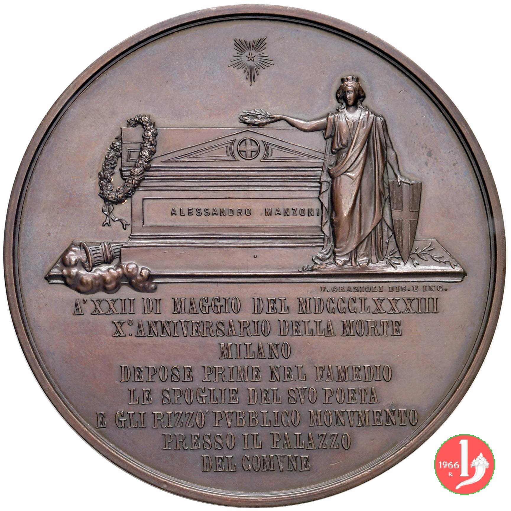 | Medaglia coniata, emessa il 22-05-1883 a ricordo dell'inaugurazione del monumento ad Alessandro Manzoni (1785-1873) in Piazza San Fedele a Milano, opera di Francesco Barzaghi. | ||||||