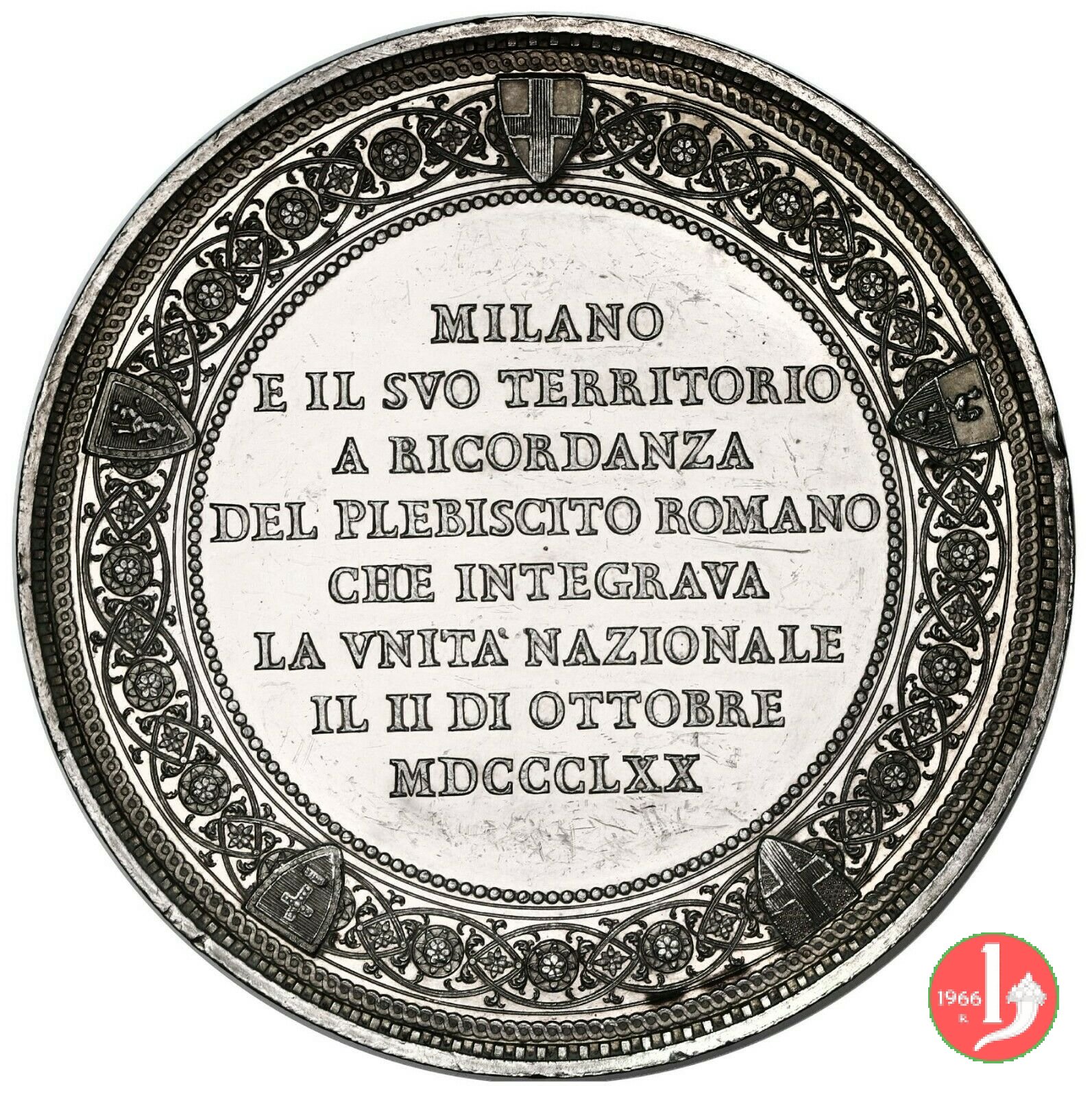 entro ampia cornice a motivi floreali con Stemma Savoia in alto: MILANO = E IL SVO TERRITORIO = A RICORDANZA = DEL PLEBISCITO ROMANO = CHE INTEGRAVA = LA VNITA' NAZIONALE = IL II DI OTTOBRE = MDCCCLXX