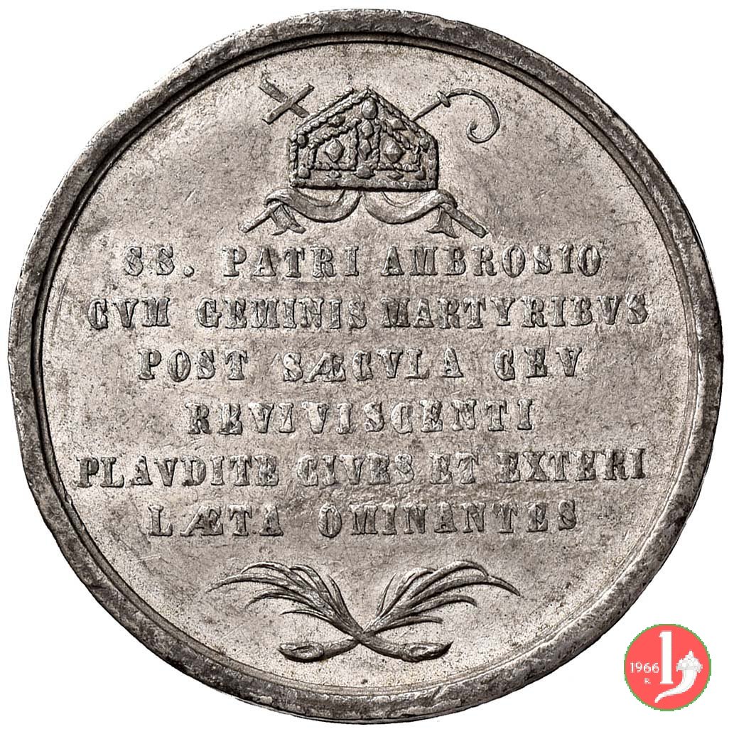 Medaglia emessa per ricordare la traslazione delle spoglie dei SS. Martiri Ambrosiani, il 14 maggio 1874 le reliquie dei tre santi, che dall835 si trovavano sotto laltare della basilica milanese di SantAmbrogio in unurna di porfido, furono deposte in una nuova teca piú preziosa, in argento e cristallo. | |||