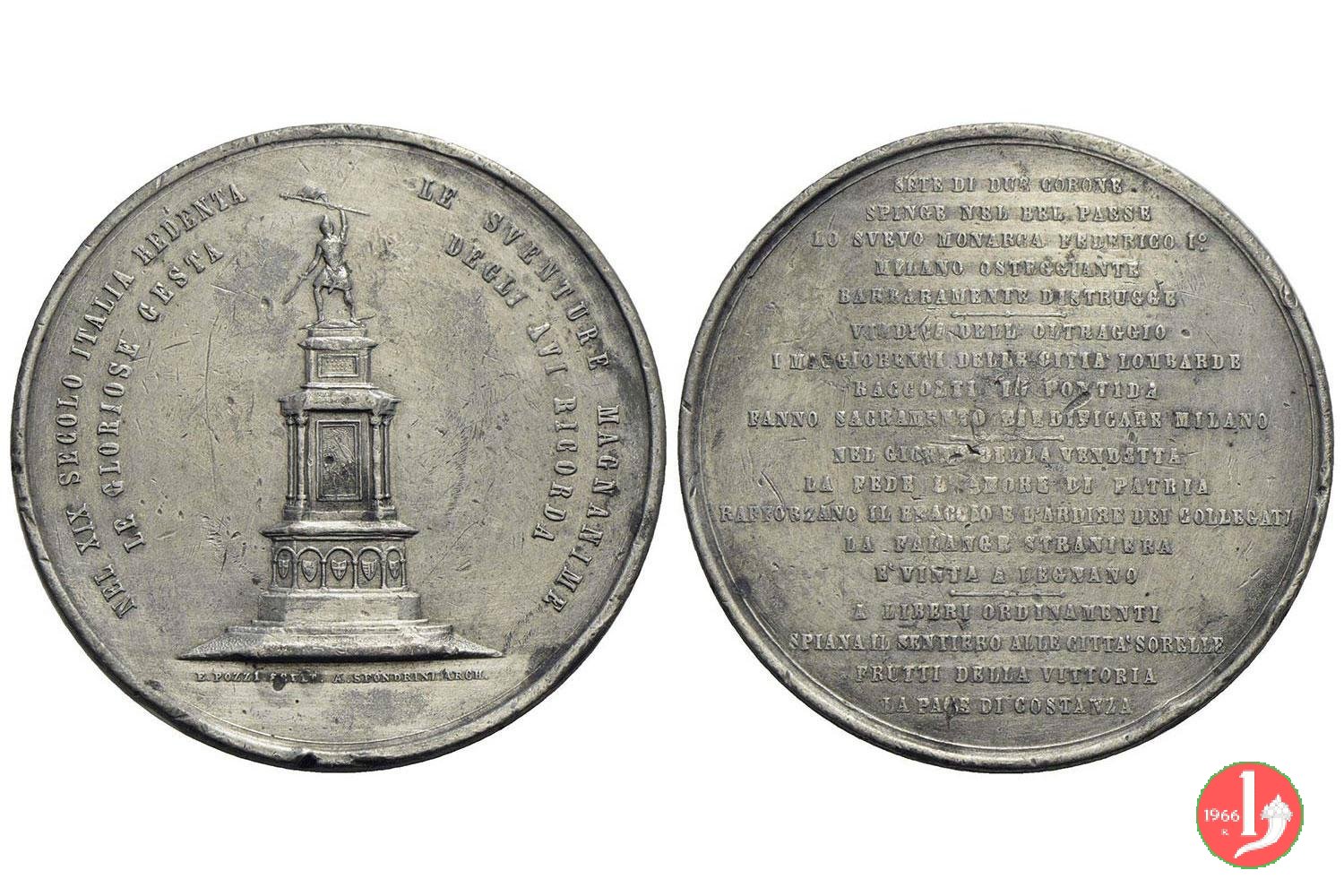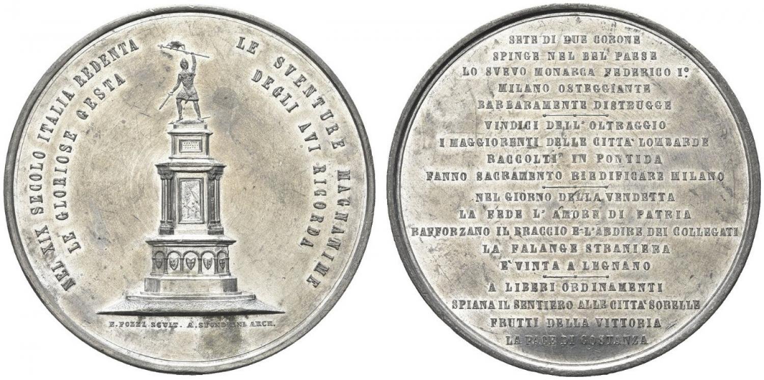 nel campo: SETE DI DUE CORONE = SPINGE NEL BEL PAESE = LO SVEVO MONARCA FEDERICO I.° = MILANO OSTEGGIANTE = BARBARAMENTE DISTRUGGE = - = VINDICI DELL'OLTRAGGIO = I MAGGIORENTI DELLE CITTA' LOMBARDE = RACCOLTI IN PONTIDA = FANNO SACRAMENTO RIEDIFICARE MILANO = - = NEL GIORNO DELLA VENDETTA = LA FEDE L'AMORE DI PATRIA = RAFFORZANO IL BRACCIO E L'ARDIRE DEI COLLEGATI = LA FALANGE STRANIERA = E' VINTA A LEGNANO = - = A LIBERI ORDINAMENTI = SPIANA IL SENTIERO ALLE CITTA' SORELLE = FRUTTI DELLA VITTORIA = LA PACE DI COSTANZA