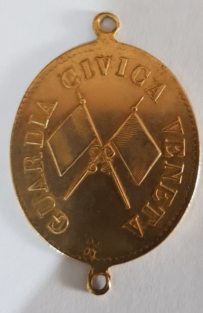 | La Guardia Civica a Venezia e Udine fu istituita il 18-03-1848 per mantenere l'ordine pubblico, la presente medaglia ovale è stata coniata in questa occasione quale premio per i volontari accorsi. | |||||||||||||||