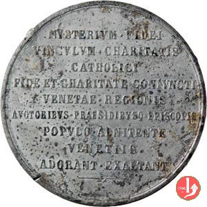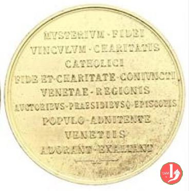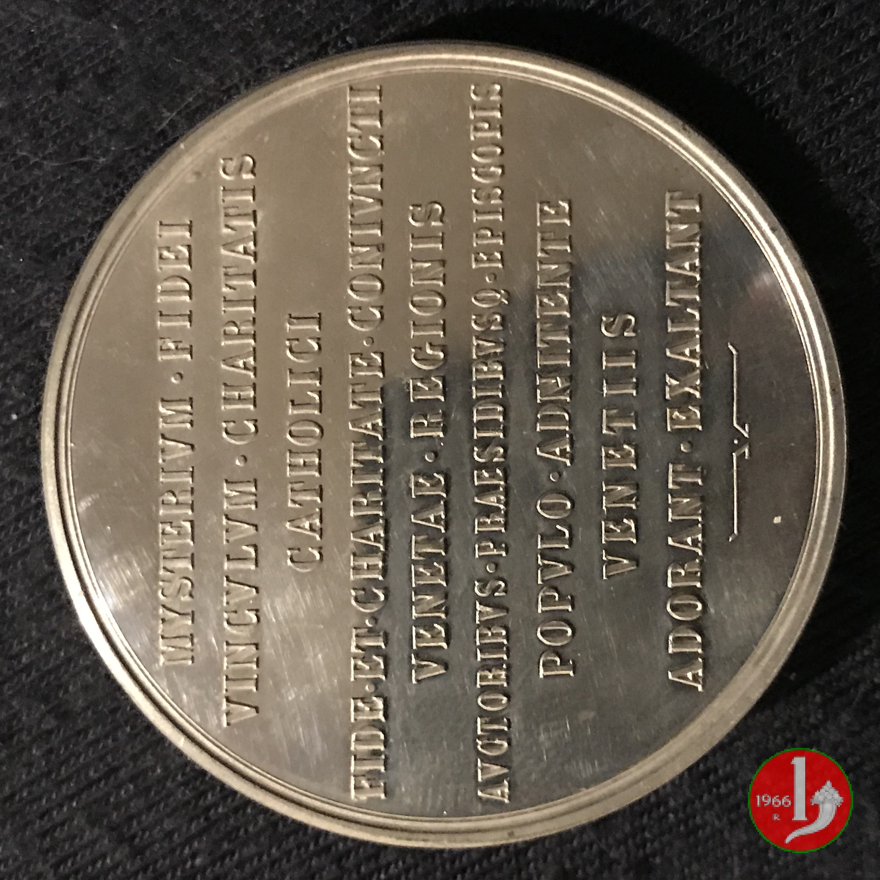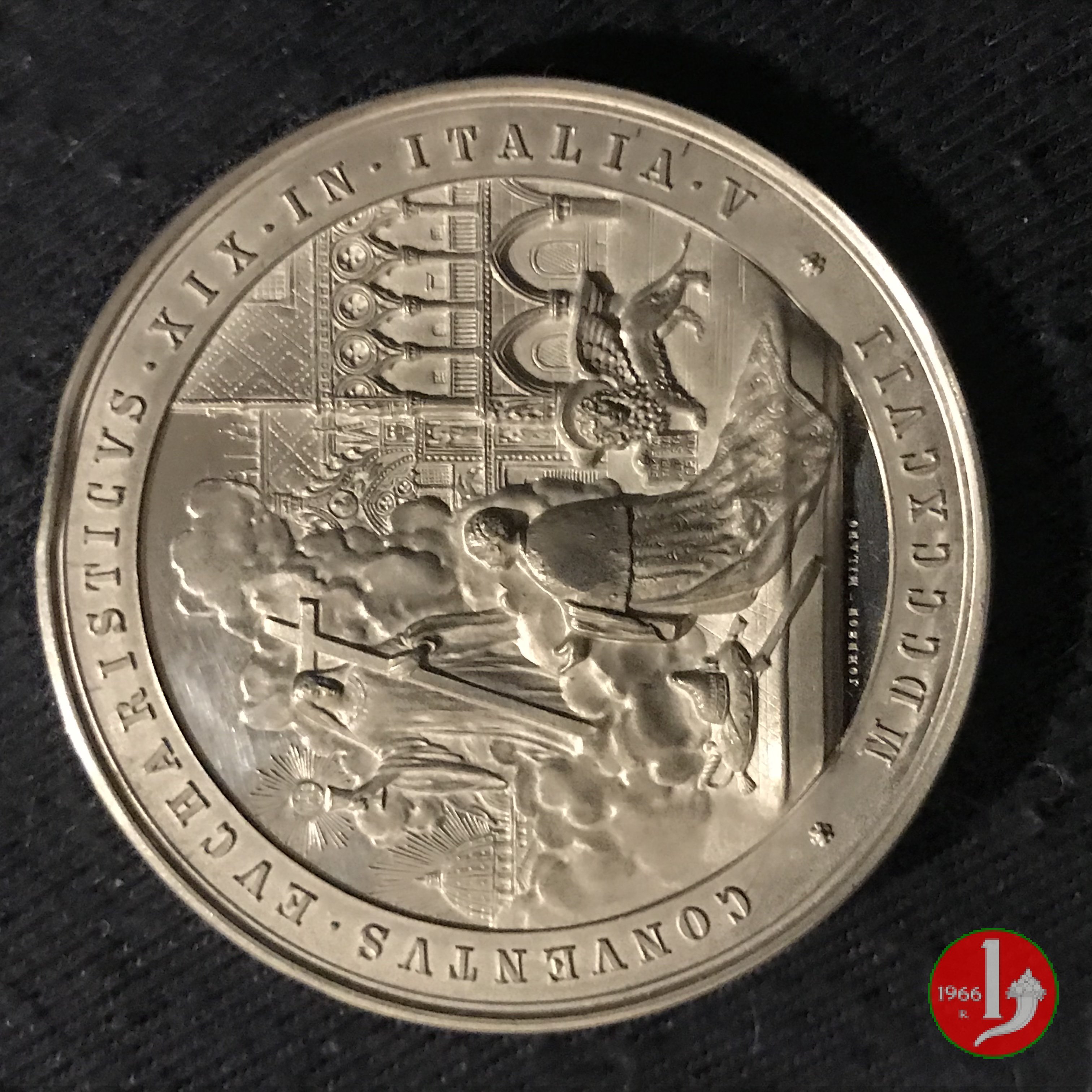Medaglia coniata, emessa nel 1897, per ricordare il XIX Congresso Eucaristico Nazionale a Venezia. Il tema del Congresso era: Fede, storia, culto dell'Eucaristia. | |||||||