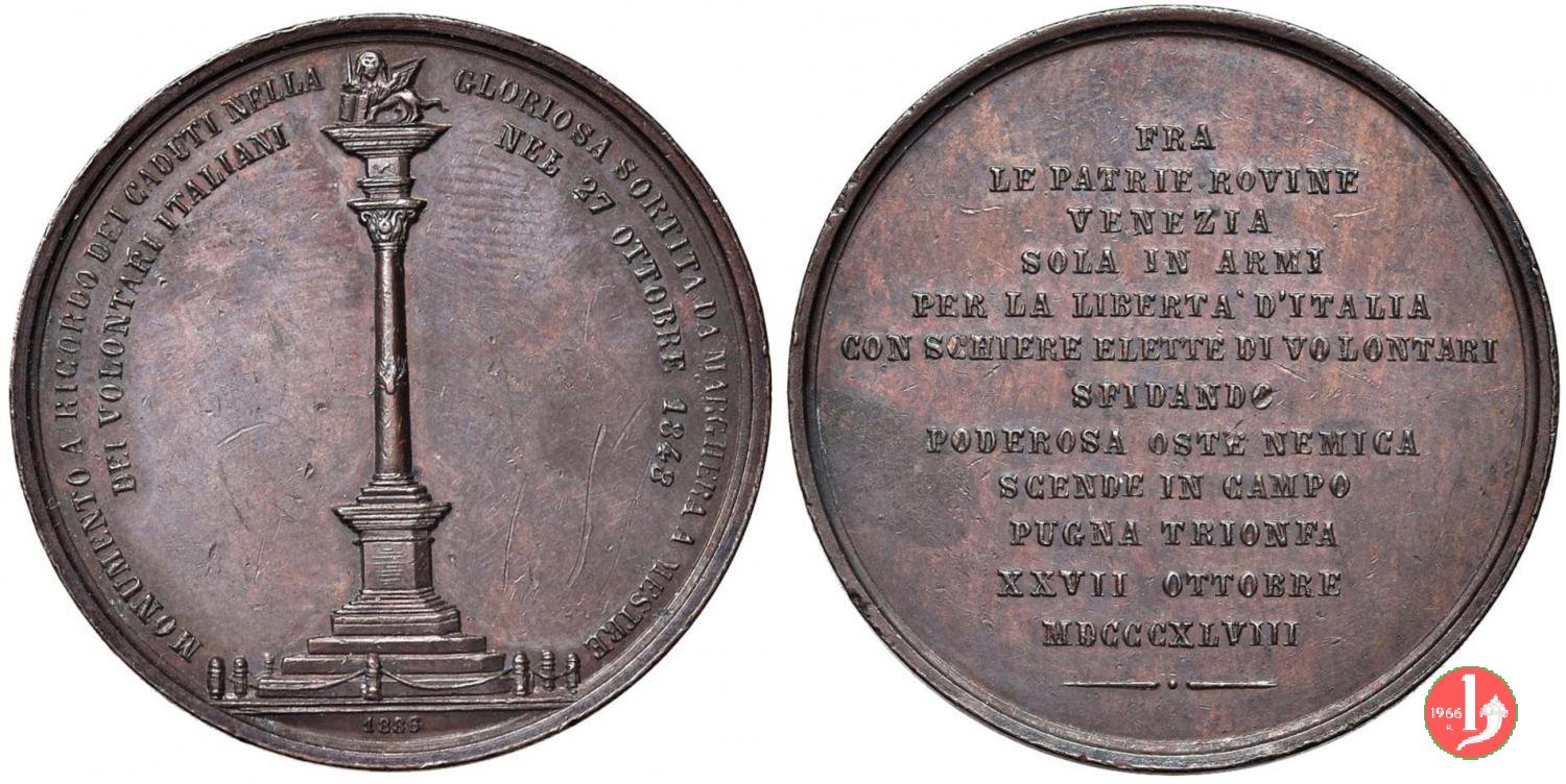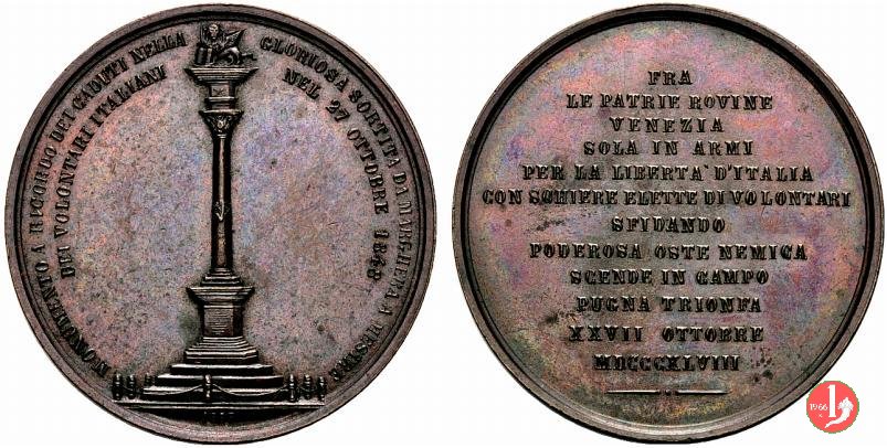 | Medaglia coniata, emessa il 04-04-1886, per ricordare l'inaugurazione del Monumento ai Caduti della sortita del 28-10-1848 eretto a Mestre in Piazza XXVIII Ottobre. | |||||