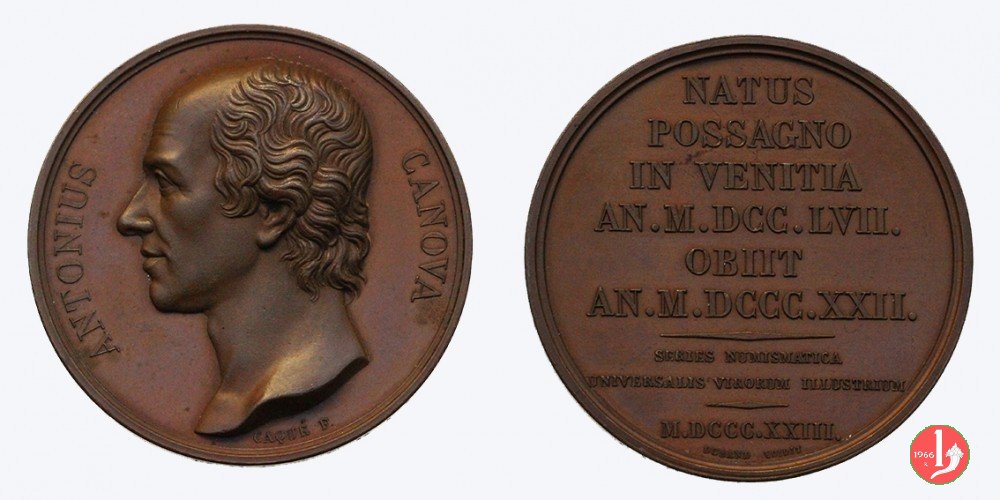 | Medaglia coniata, realizzata per la serie Uomini Illustri Internazionale, a ricordo di Antonio Canova (1757-1823) scultore. | |||||||