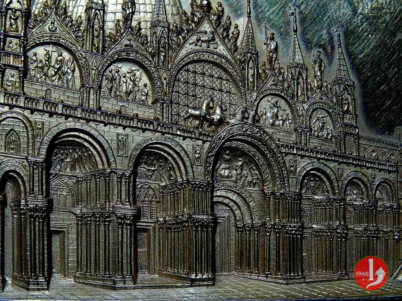 Doge genuflesso a Santa che reca Crocefisso e Calice con ostia raggiante, a dx leone di San Marco e a sx corno dogale su cuscino, sullo sfondo angolo di Palazzo Ducale e l'orologio dei Mori in Piazza San Marco