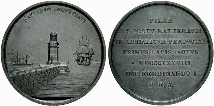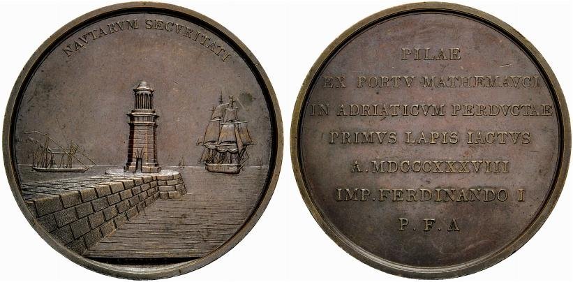 | Medaglia coniata, emessa il 13-10-1838, per ricordare la Posa della prima pietra della diga esterna al Porto veneziano di Malamocco. | |||||