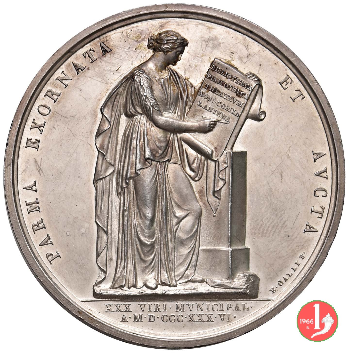 Medaglia coniata, emessa nel 1836, per ricordare l'inaugurazione dell`edificio delle Beccherie in Piazza Ghiaia a Parma, opera dell'Architetto Nicola Bettoli.