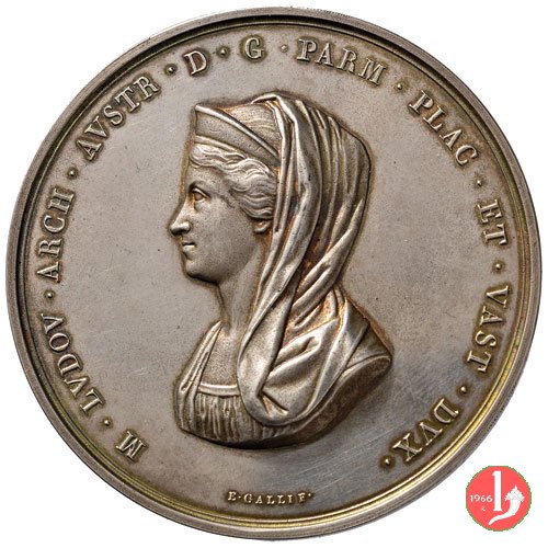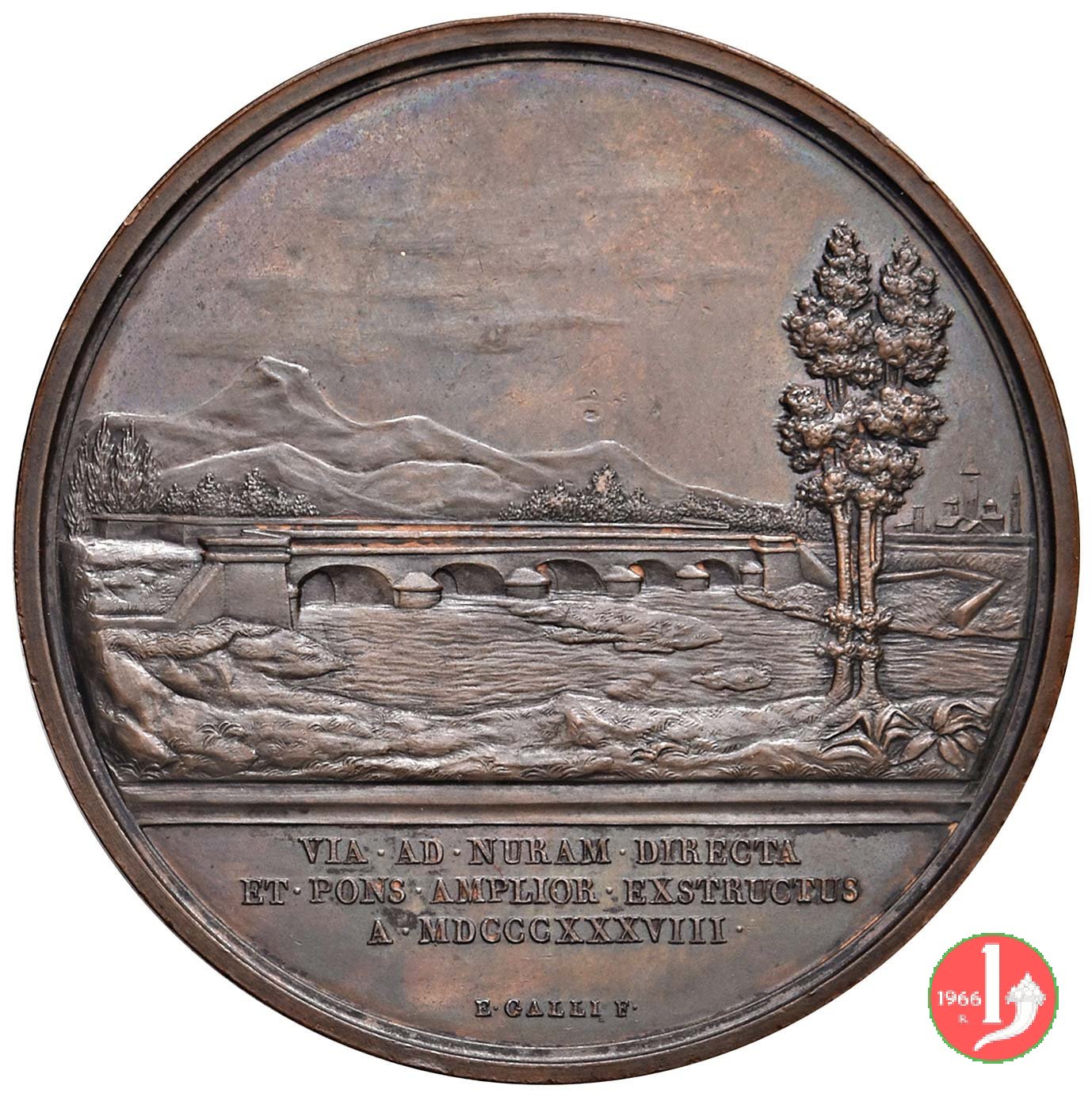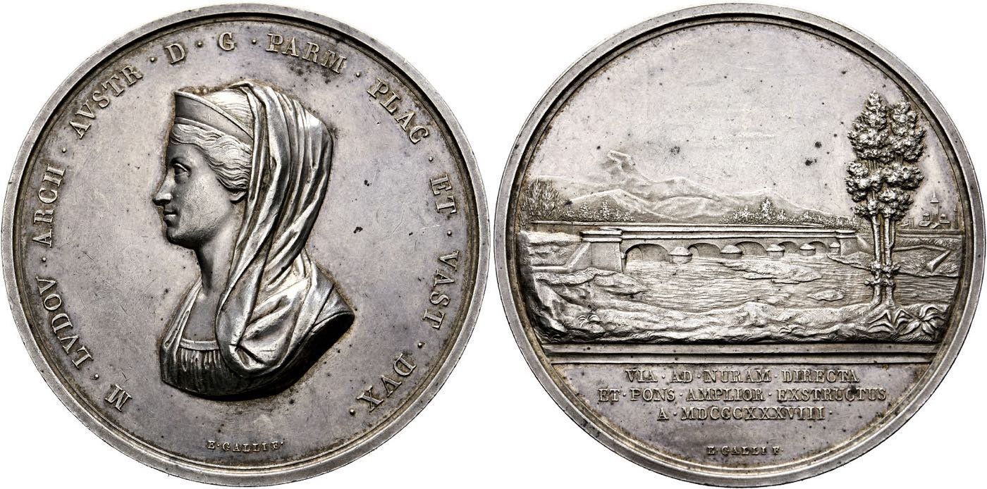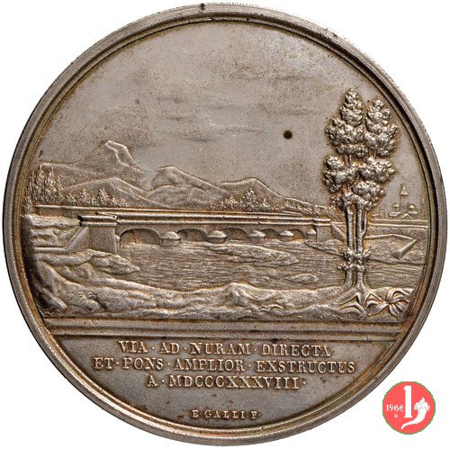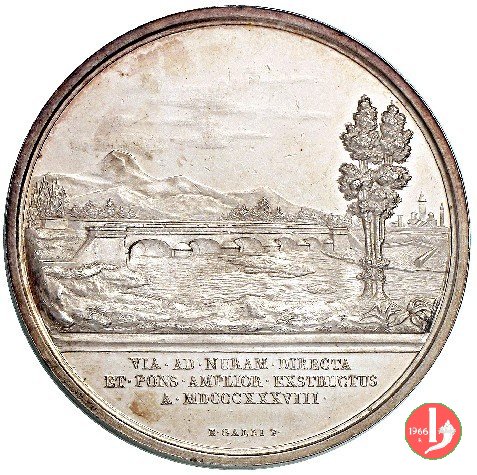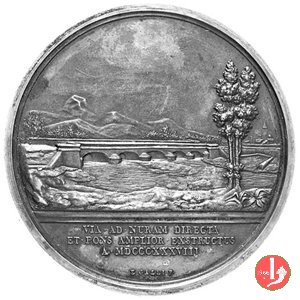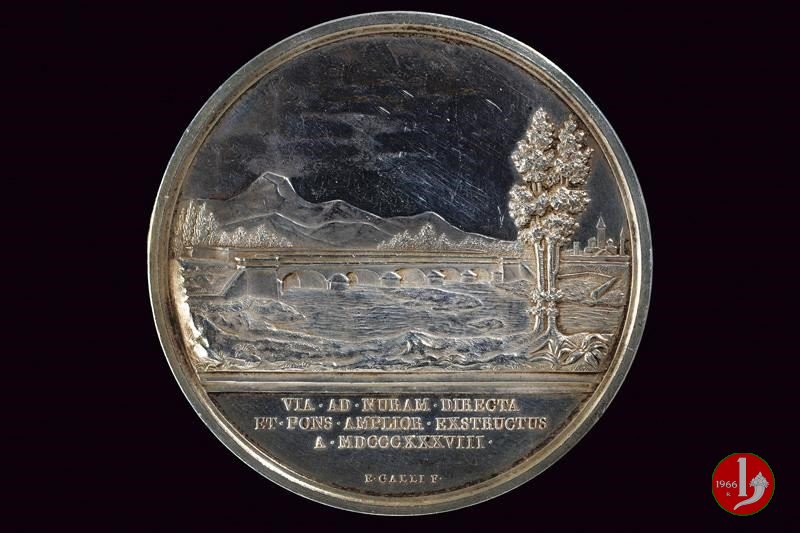 Medaglia coniata, emessa per ricordare la costruzione del Ponte sul Fiume Nure, inaugurato il 09-05-1838. E' l'ultima medaglia realizzata da Ettore Galli che morí a soli 30 anni il 17-09-1841. | ||||||||