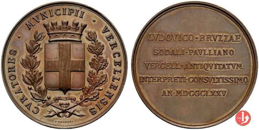 Medaglia coniata, emessa il 19-06-1875, dal Comune di Vercelli, per celebrare il conferimento della Cittadinanza Onoraria a Luigi Bruzza - Archeologo.