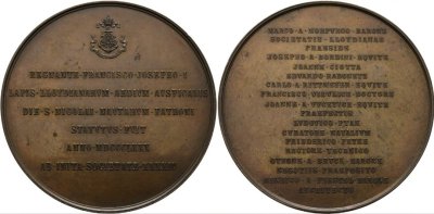 | Medaglia coniata, realizzata nel 1880, per ricordare la posa della pietra fondamentale dell'edificio del Lloyd austriaco a Trieste | |||||
