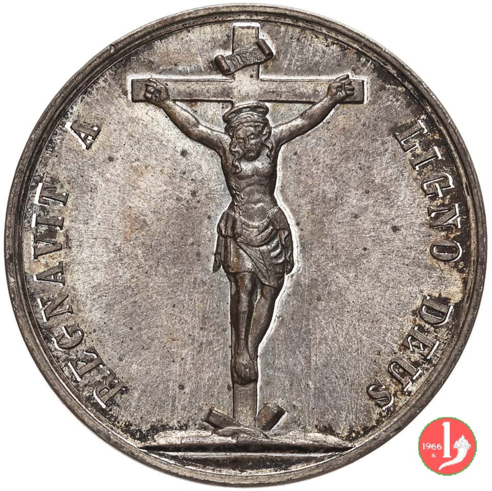 | Medaglia coniata, realizzata nel 1899 a ricordo del Pellegrinaggio al SS. Crocifisso di Borgo Bugliano, presso Pescia. | ||||||||||||||