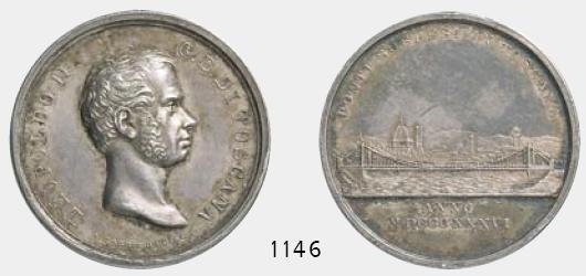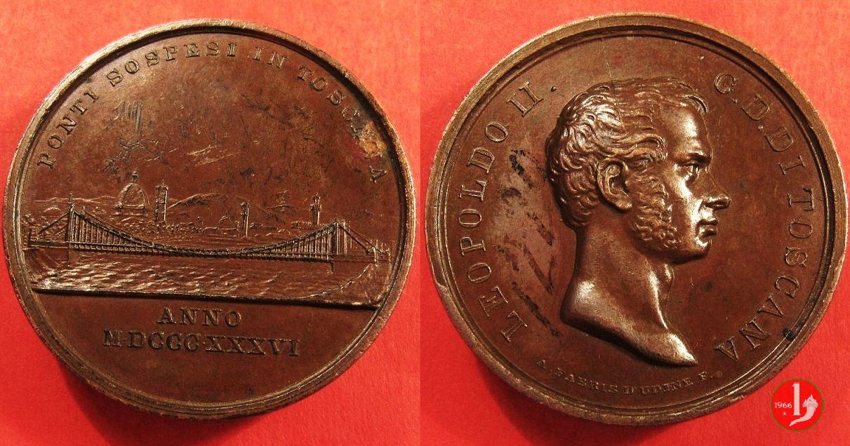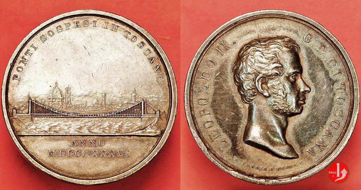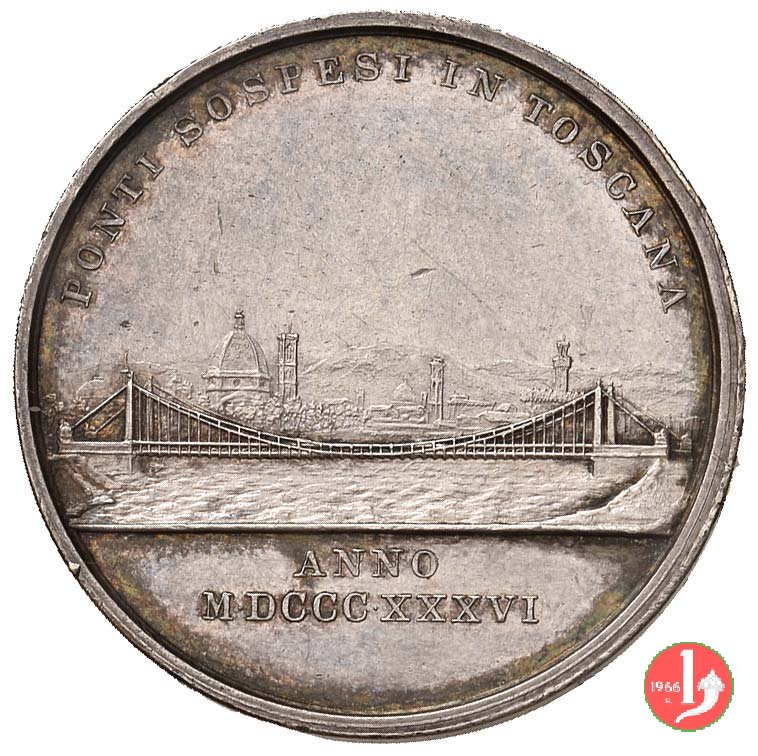 Medaglia coniata, emessa nel 1836 a ricordo dell'inaugurazione dei Ponte sospeso sull'Arno in Firenze fu intitolato a San Leopoldo e sostituito, dopo la rovina, nel 1925 da un ponte in muratura che fu distrutto dai tedeschi nel 1944; venne ricostruito subito dopo la guerra e chiamato Ponte della Vittoria.