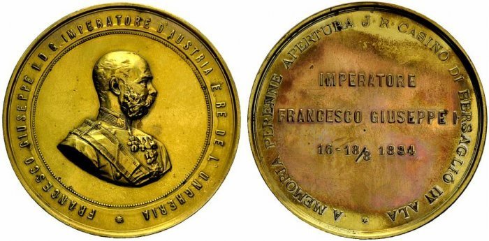 | Medaglia coniata, realizzata nel 1884 a ricordo dell'apertura del casino di Bersagio ad Ala. | |||||