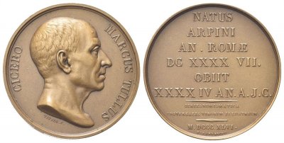 | Medaglia coniata, realizzata nel 1846, fa parte della serie Uomini Illustri Universale, a ricordo di Marco Tullio Cicerone (106 a.c. - 43 a.c.) avvocato, scrittore, politico, filosofo e oratore romano. | ||||