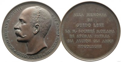 | Medaglia coniata, emessa nel 1893, a ricordo di Guido Levi (Soragna 8 luglio 1852-Roma 15 agosto 1893) Segretario della Reale Società di Storia Patria. | |||||