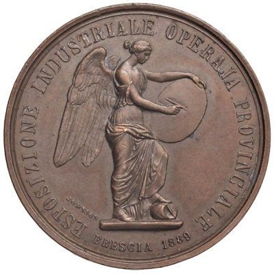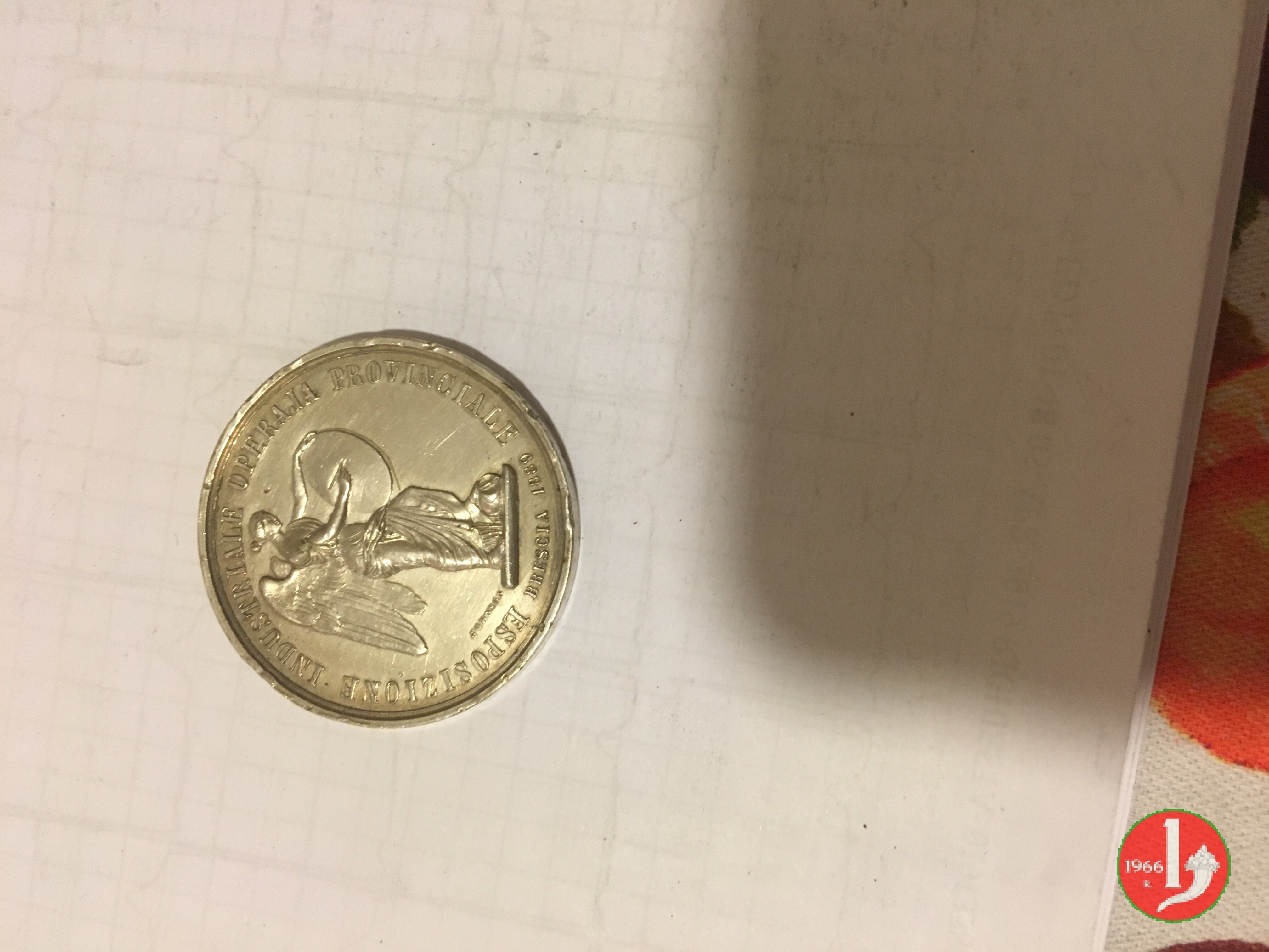 | Medaglia premio coniata, realizzata nel 1889 a ricordo dell' Esposizione Industriale Provinciale Operaia, aperta il 18 agosto presso la Crociera di San Luca. | |||||