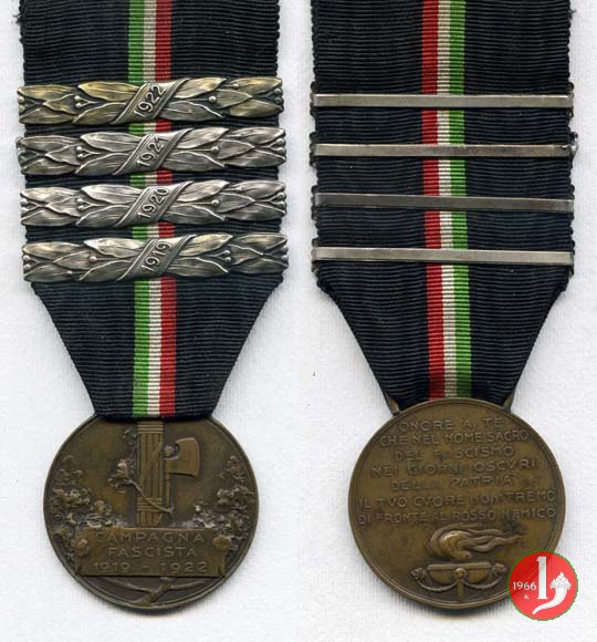 entro targa su fascio, tra rami d'alloro: CAMPAGNA = FASCISTA = 1919-1922 nel campo: ONORE A TE = CHE NEL NOME SACRO = DEL FASCISMO = NEI GIORNI OSCVRI = DELLA PATRIA = IL TVO CVORE NON TREMO' = DI FRONTE AL ROSSO NEMICO