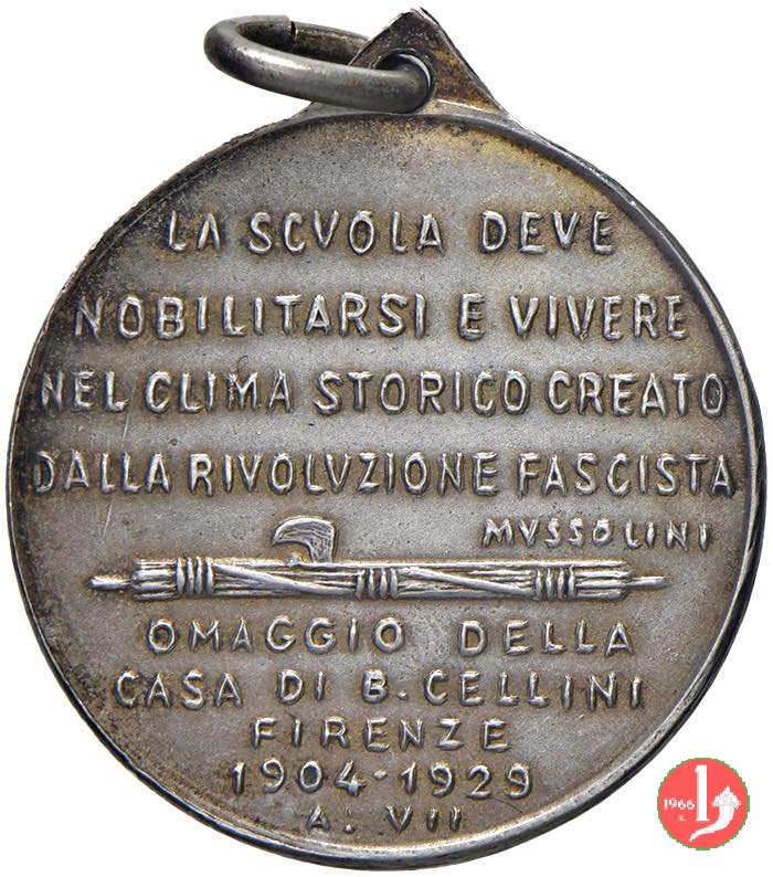 nel campo: LA SCVOLA DEVE = NOBILITARSI E VIVERE = NEL CLIMA STORICO CREATO = DALLA RIVOLVZIONE FASCISTA = MVSSOLINI = fascio orizzontale = OMAGGIO DELLA = CASA DI B. CELLINI = FIRENZE = 1904-1929 = A. VII