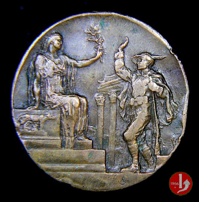 la figura allegorica di Roma, seduta in trono, a dx, porge serto d'alloro ad Alpino che saluta romanamente, sullo sfondo vestigia romane