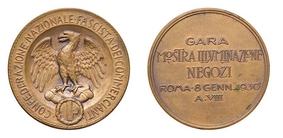 Medaglia coniata, realizzata nel 1930 per la Federazione Nazionale fascista Commercianti di Roma. Fu utilizzata per svariante manifestazioni modificandone il verso (legende).
