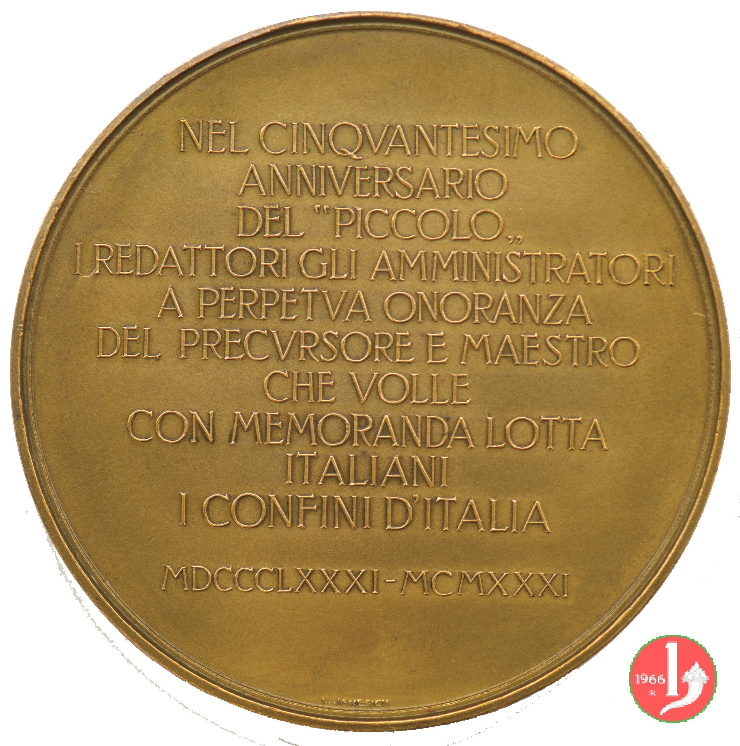 nel campo: NEL CINQVANTESIMO = ANNIVERSARIO = DEL "PICCOLO" = I REDATTORI GLI AMMINISTRATORI = A PERPETVA ONORANZA = DEL PRECVRSORE E MAESTRO = CHE VOLLE = CON MEMORANDA LOTTA = ITALIANI = I CONFINI D'ITALIA = MDCCCLXXXI MCMXXXI