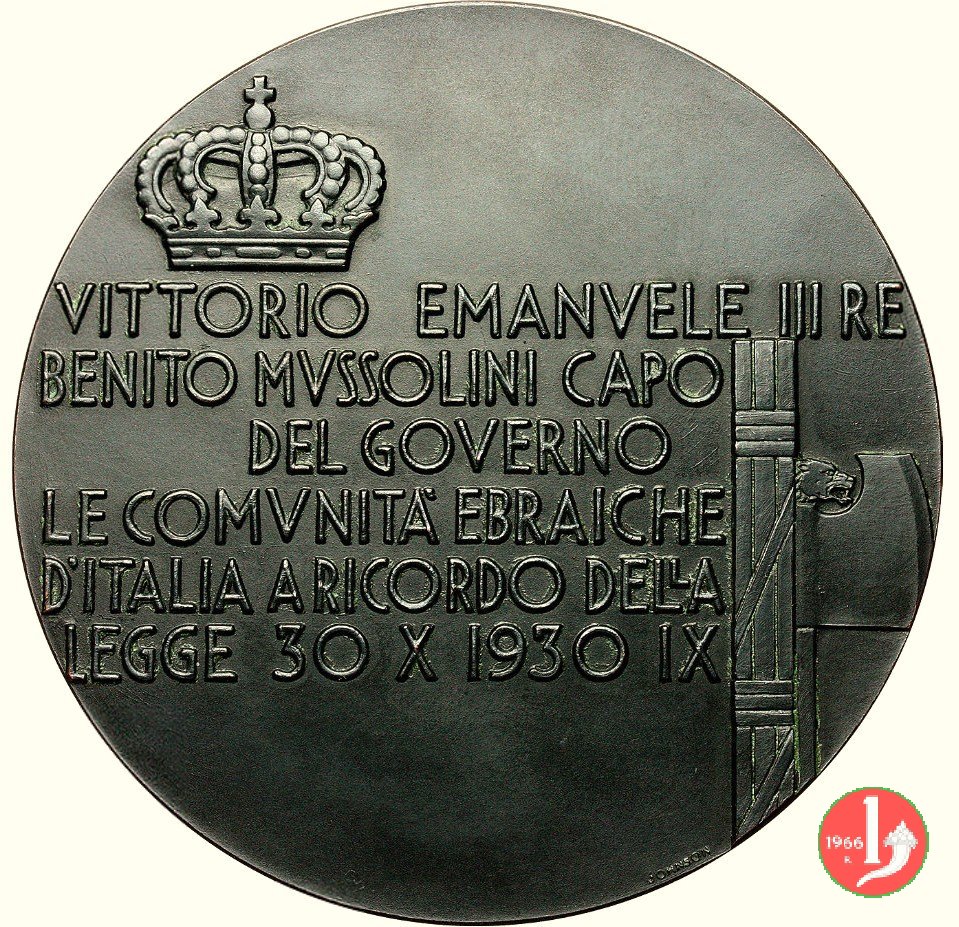 nel campo: VITTORIO EMANVELE III RE = BENITO MVSSOLINI CAPO = DEL GOVERNO = LE COMVNITA' EBRAICHE = D'ITALIA A RICORDO DELLA = LEGGE 30.X.1930.IX